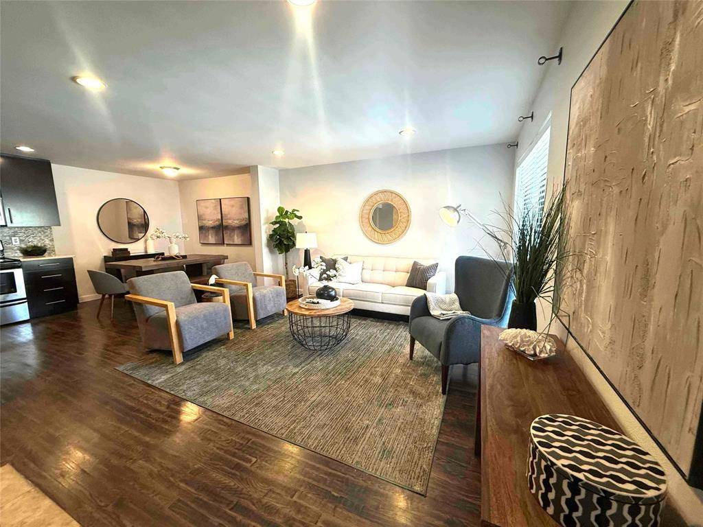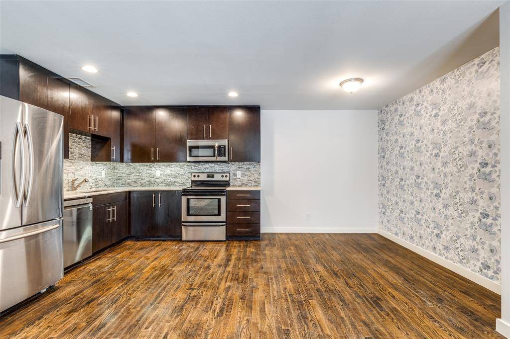 Charming ground-floor unit with poolside views and a spacious open floorplan! Enjoy a bright and inviting living area with large windows overlooking beautifully landscaped grounds. The private patio offers a perfect spot to relax outdoors. Inside, you'll find thoughtful finishes including hardwood floors, granite countertops, stainless steel appliances, and a gas fireplace. The gated community features a resort-style pool and spa, outdoor grilling areas, a firepit, and mature palm trees that give the space a relaxed, vacation-like feel. Conveniently located in the heart of central Dallas, this unit also includes two assigned, covered parking spots. Only 2 blocks from Central Market, Tom Thumb, LA Fitness, and Old Town shopping center