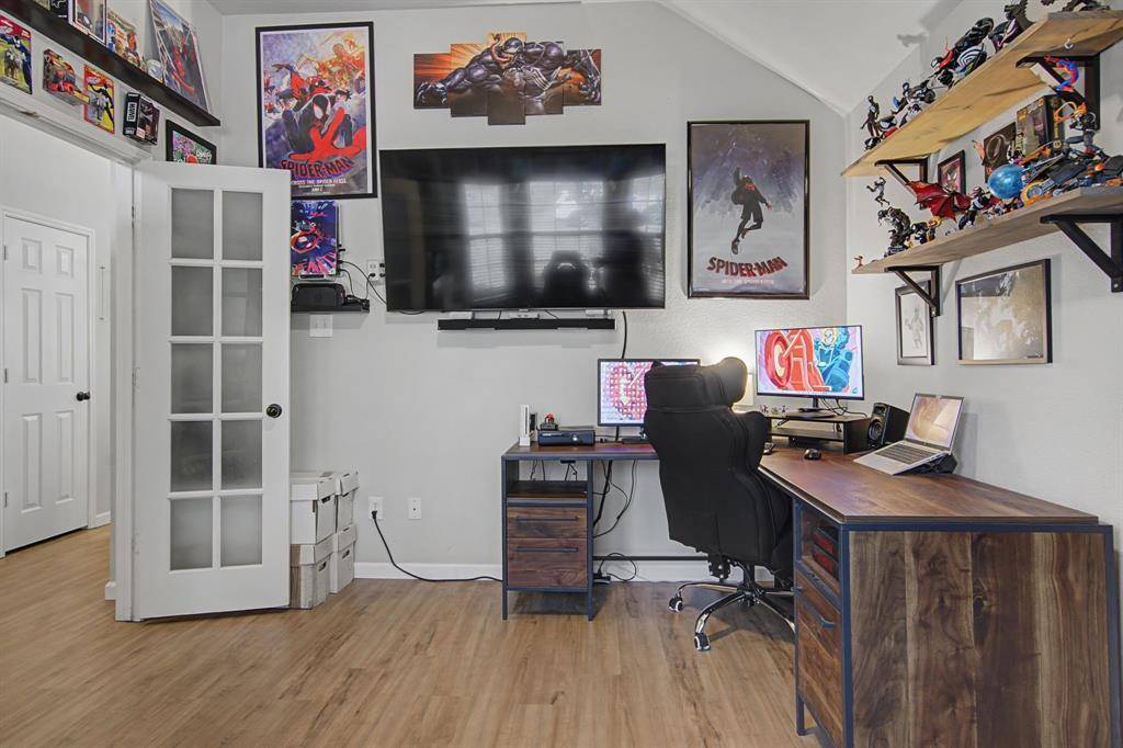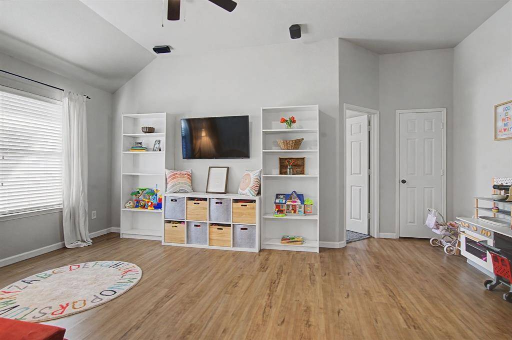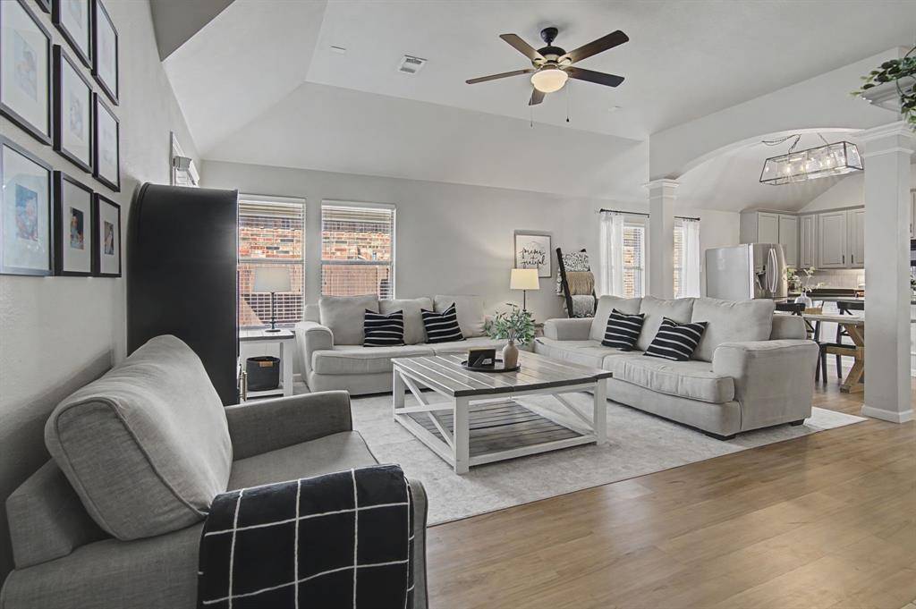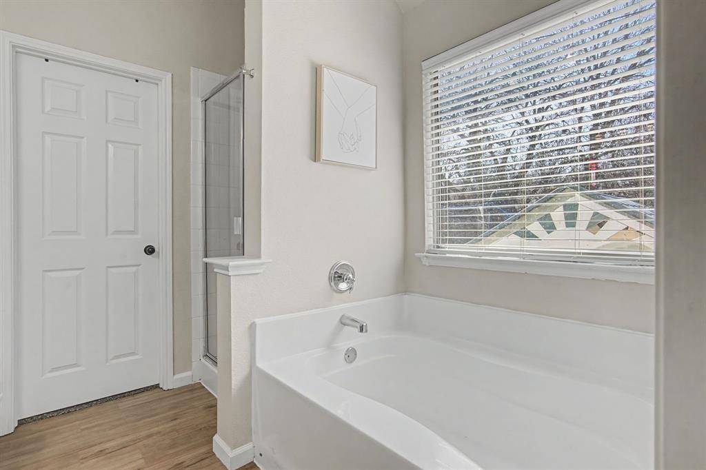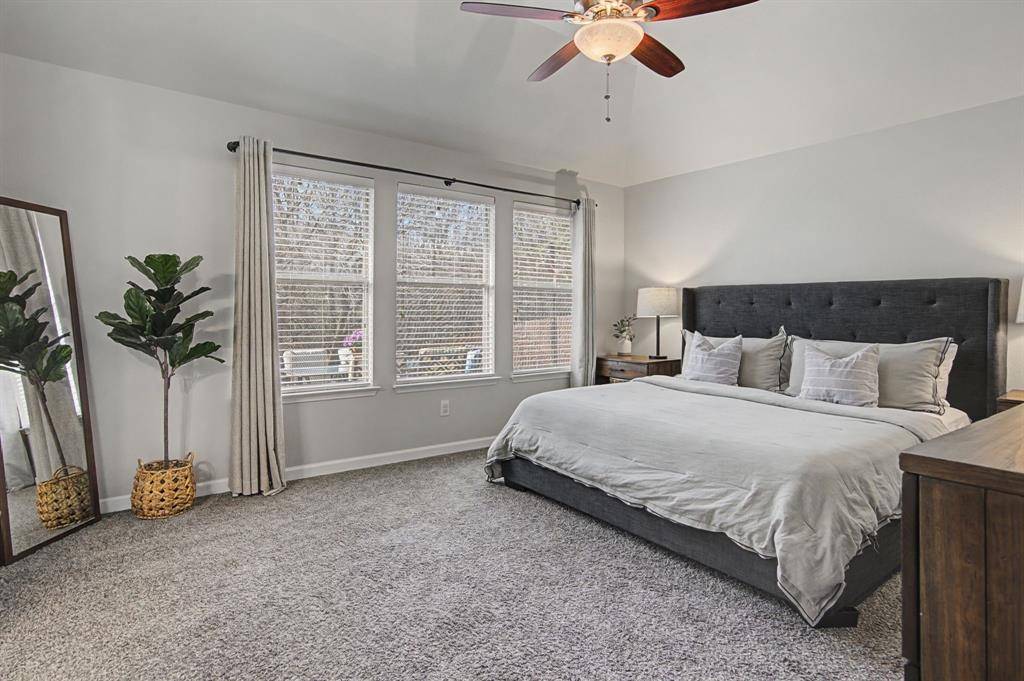 This immaculate move-in ready home offers 3 bedrooms, 2 full baths and a designated study which is perfect for a home office, It features bay windows for plenty of light and it is located at the front of the house for added privacy. The kitchen updates include painted cabinets and updated black hardware, updated range and dishwasher. A gas connection is available in the kitchen. The large living area features a fireplace with a gas starter and has windows to the private back yard. The second living area is currently used as a play area. The large master bedroom also has windows to the backyard. The master bath features a garden tub and separate shower. The open concept is light and bright! Some additional recent updates include updated light fixtures, painting, ceiling fans, luxury vinyl plank in main areas and carpet in the bedrooms. Other improvements include updated HVAC and hot water heater as well as the replacement of the retaining wall. The patio has been extended in the private backyard which backs to a wooded area and small creek. The community includes a pool, and playground. A city park nearby also has a pool, splash pad, jogging trail and more! Highly desirable Prosper ISD. Note: the grass is already becoming greener and the trees will have leaves soon making the backyard even more private and a much nicer view in the back!