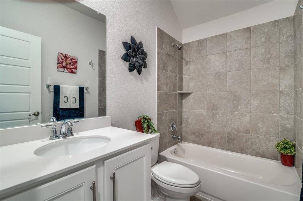 Nestled on an oversized .225-acre corner lot, this inviting home offers exceptional outdoor appeal and a thoughtfully designed interior. The tiled front porch provides a shaded spot to relax and enjoy the beautifully manicured yard. Stepping inside, you'll find a spacious open floorplan designed for both comfort and functionality. The kitchen boasts a large island, gas range, and sleek quartz countertops, and flows effortlessly into the living room for a bright, connected feel. A separate dining area offers a welcoming setting for casual meals or special occasions. The primary suite features dual sinks, a separate shower, a large walk-in closet, and a newer walk-in bathtub backed by a lifetime warranty. A flexible bonus room adds versatility, perfect for a home office, guest room, or playroom. The garage is finished with a clean and durable epoxy floor. Step into the backyard retreat, where a cedar-covered porch with tile flooring and a classic porch swing creates the ideal space to unwind. The large lot provides plenty of room to expand the fence, offering the potential for a larger backyard or even a pool. Washer, dryer, refrigerator, and the mounted living room TV will convey with the sale. Located within walking distance to Garcia Elementary, the home also includes access to community amenities such as walking trails, parks, catch-and-release ponds, dog stations, a clubhouse with a gym, and four sparkling swimming pools. This home blends comfort, convenience, and charm in every detail.