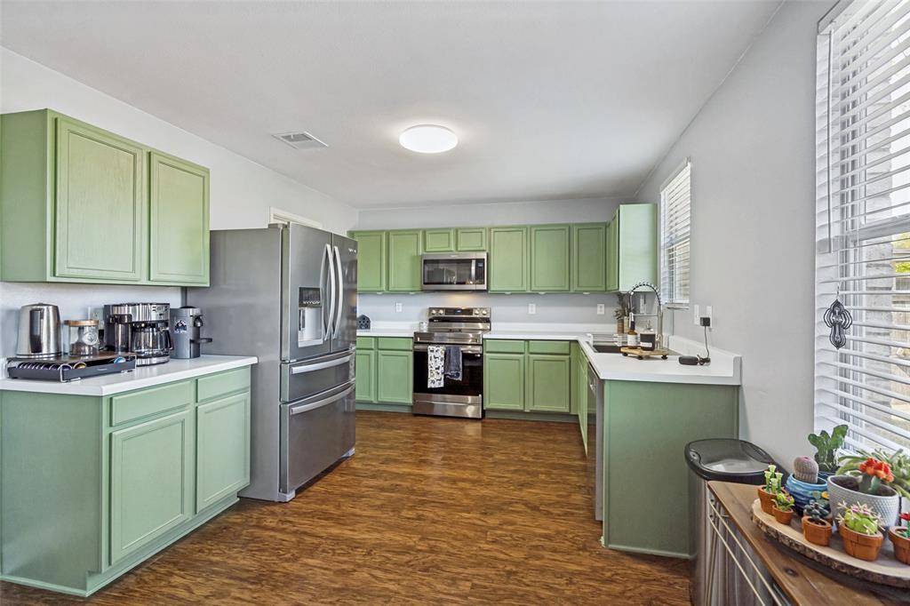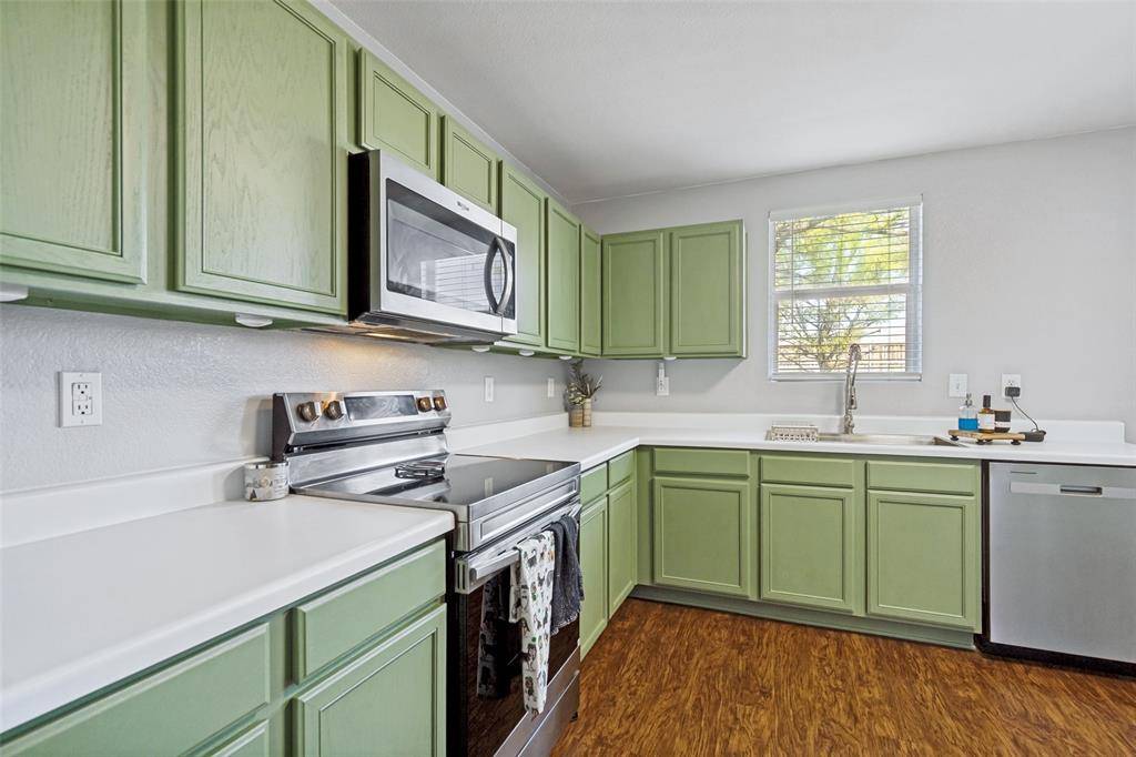 The kitchen features updated stainless steel appliances and a charming eat-in area, ideal for casual meals and gatherings. A front-load washer and dryer are also included for added convenience.