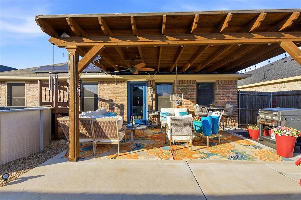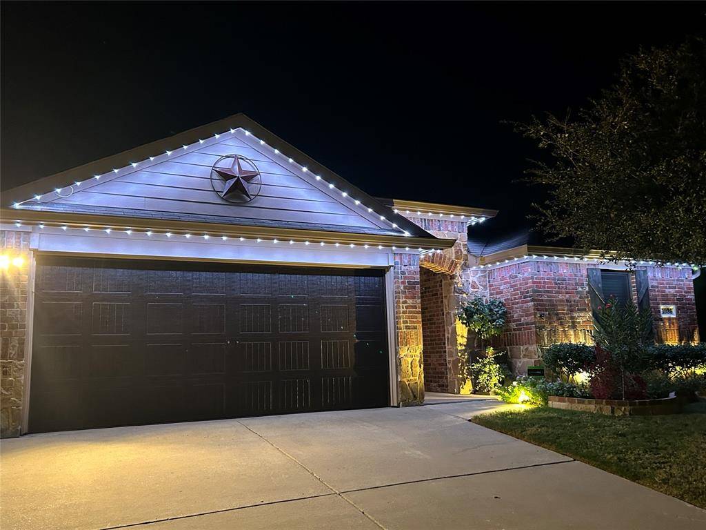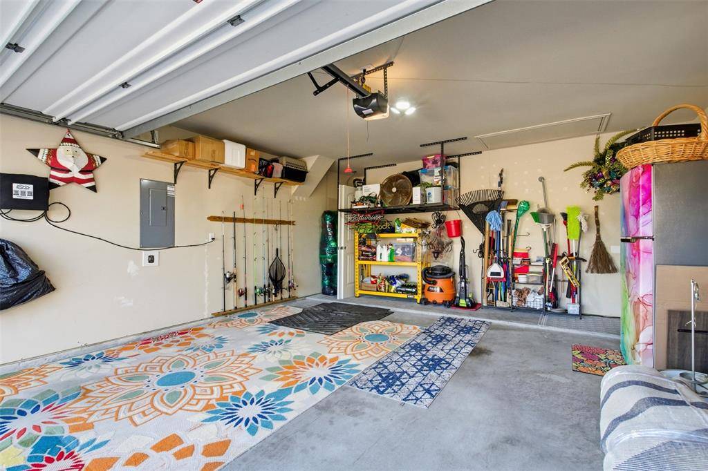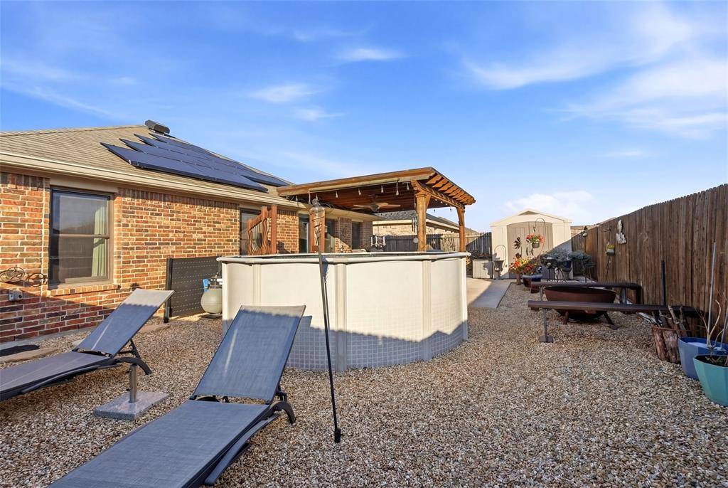 Energy efficiency and comfort are elevated radiant barrier roof decking and insulation, oversized gutters and downspouts, and Renewal by Andersen windows with transferable warranty. The home also features a new front door with glass, ProVia SOLAR energy-saving backdoor and panels, upgraded door handles throughout, and cordless window blinds. Outdoor living is exceptional with an extended concrete patio, pergola, landscape lighting, permanent holiday and security lighting, and enhanced front landscaping borders. Enjoy the above-ground pool and pergola creating the perfect backyard retreat. Three backyard storage buildings provide ample space for tools and equipment, all within a private fenced yard. A dedicated trash can patio and ceiling-mounted garage storage add even more convenience.
