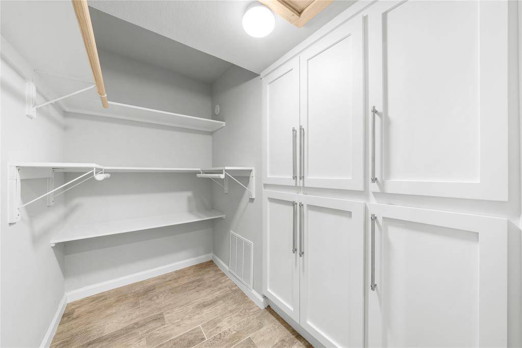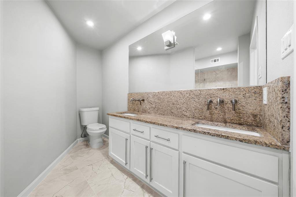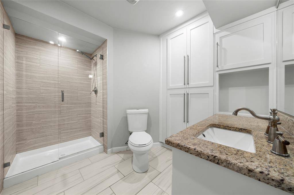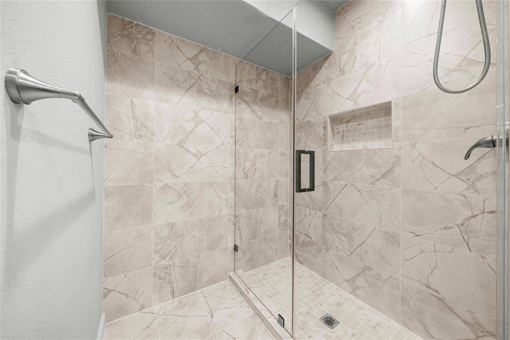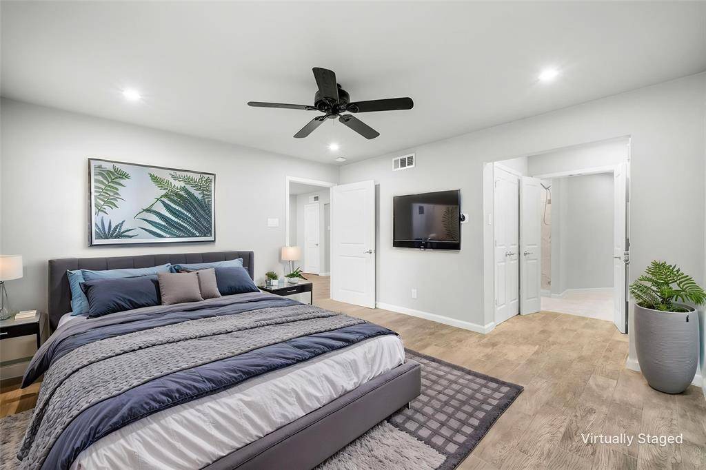 The primary suite has been thoughtfully enhanced with a fully remodeled bathroom, now offering a more modern and refined feel to complement the generous layout. A large walk-in closet with built-ins, dual sinks, and a separate glass shower complete the space.