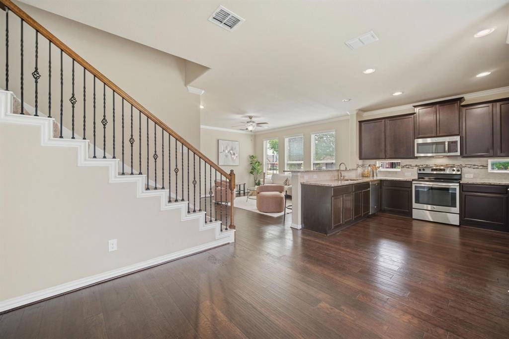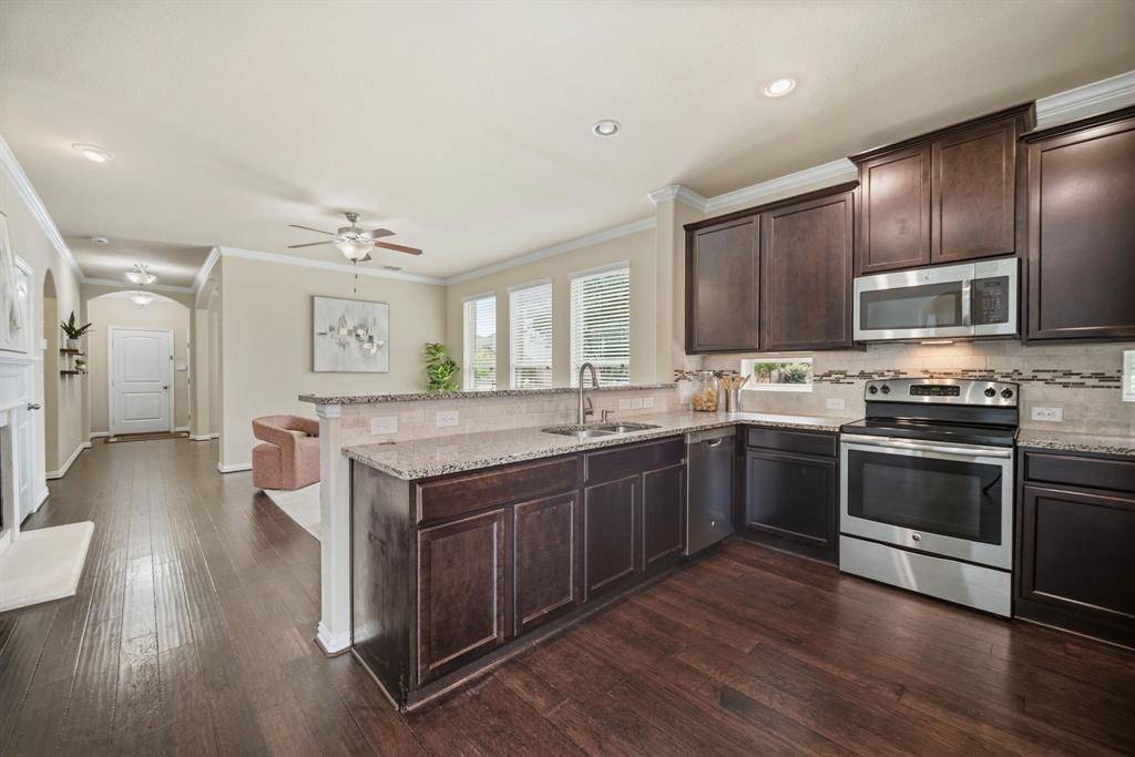 The main level showcases elegant hardwood flooring and an open-concept design, where a well-appointed kitchen with granite surfaces and stainless steel appliances overlooks a warm, inviting living space centered around a fireplace.