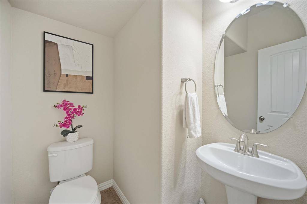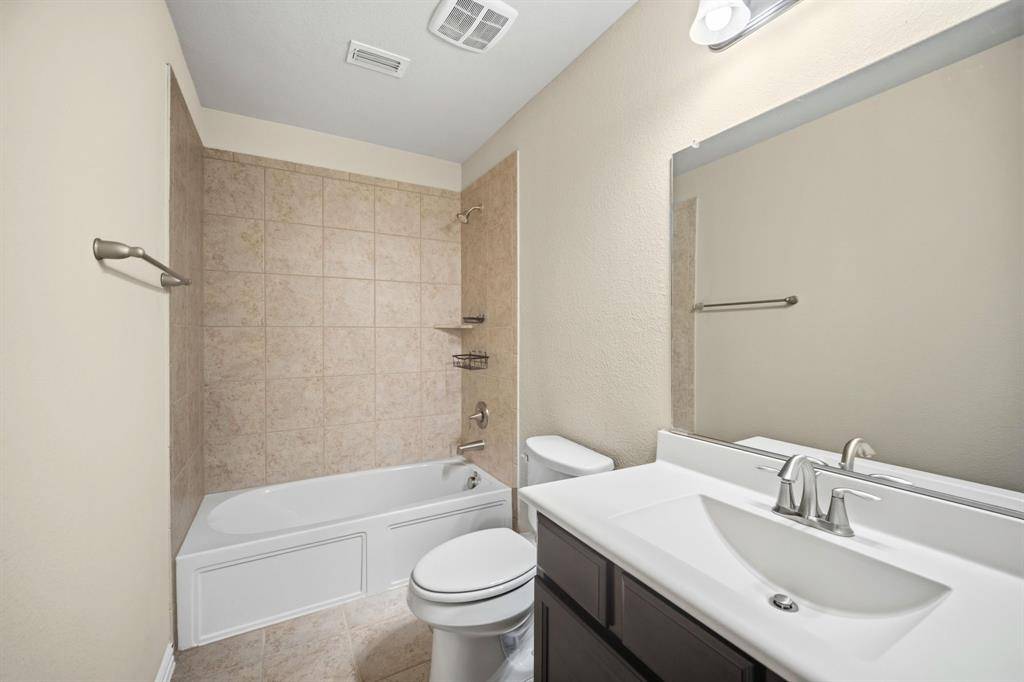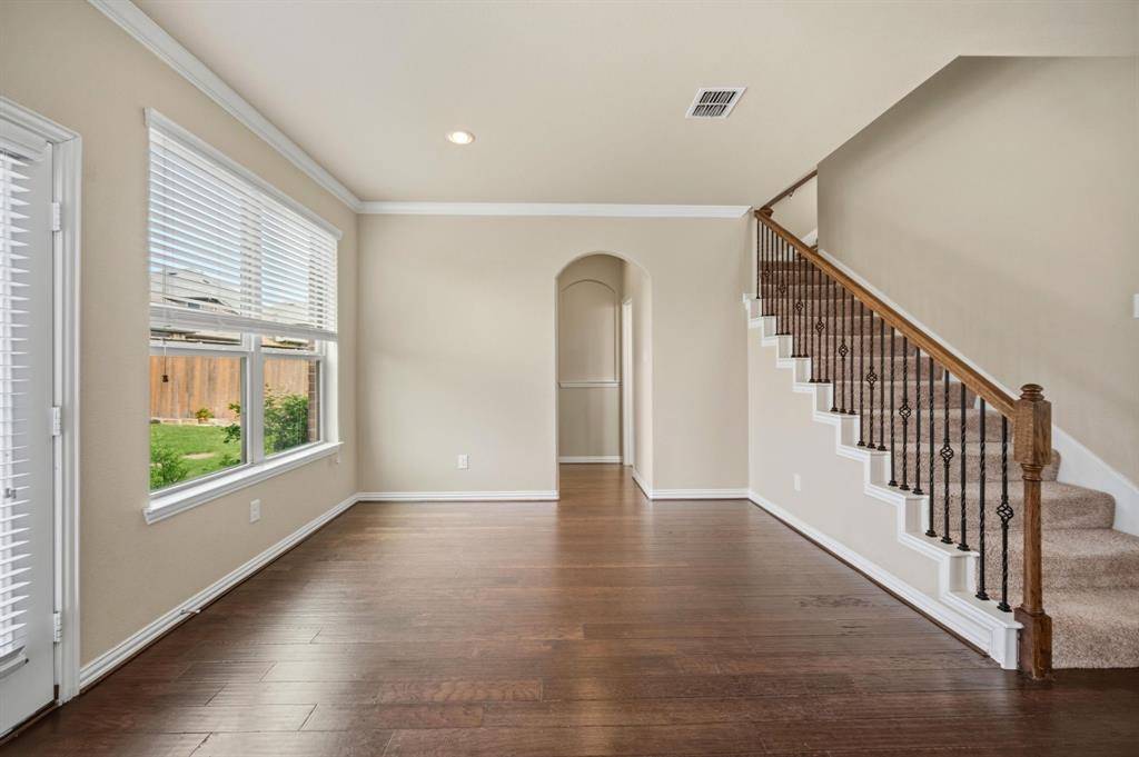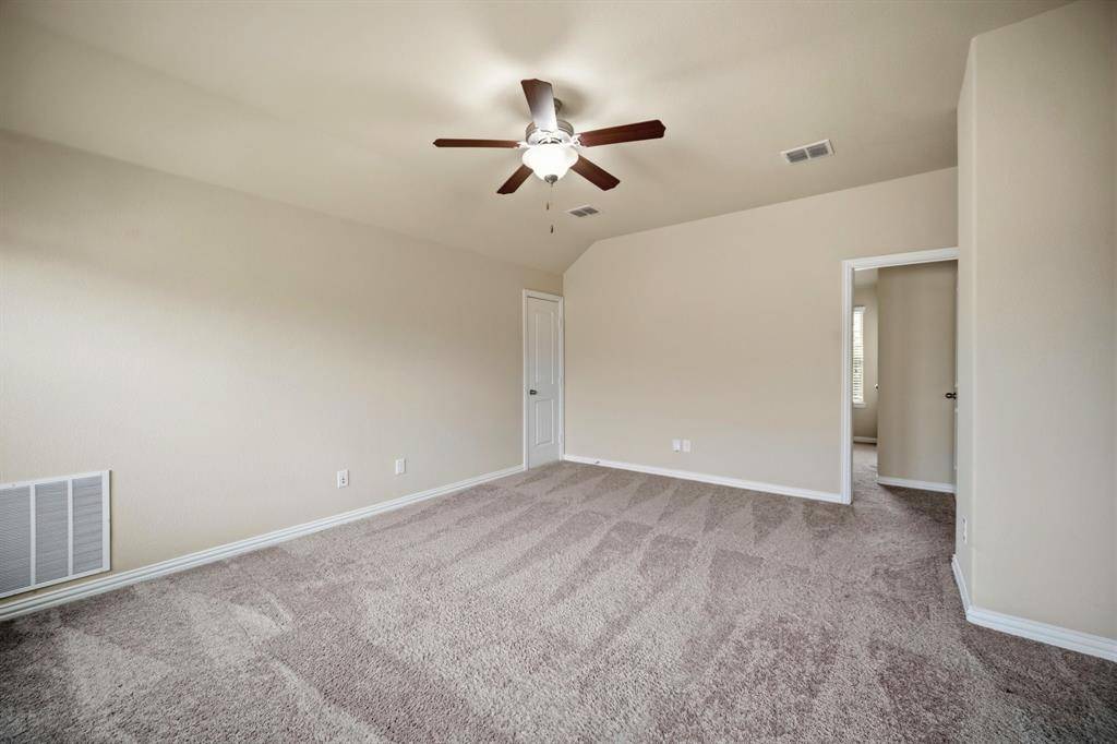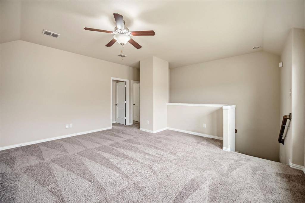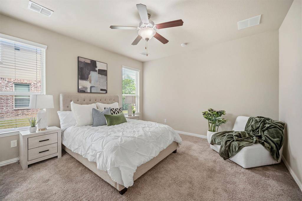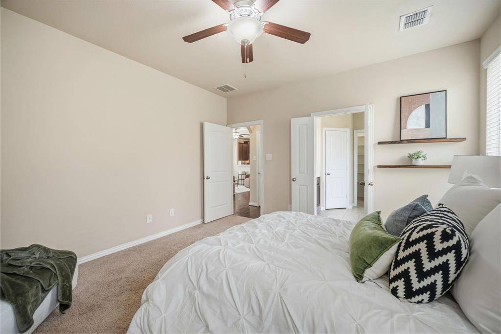 The first-floor primary suite offers a serene escape, complete with a spa-inspired bath featuring a soaking garden tub, separate shower, and dual vanities. Upstairs, a striking wrought iron staircase leads to an expansive secondary living area and three additional bedrooms—creating flexible space for both entertaining and everyday living.