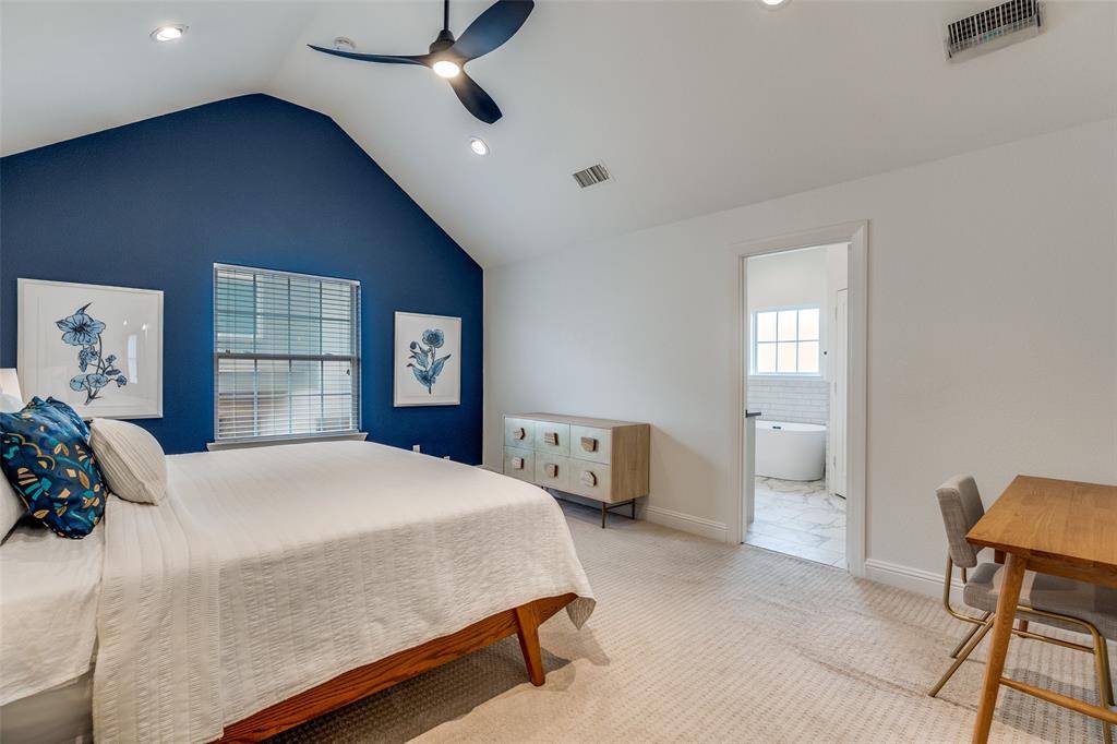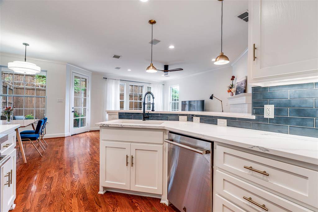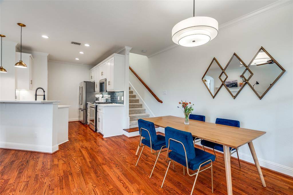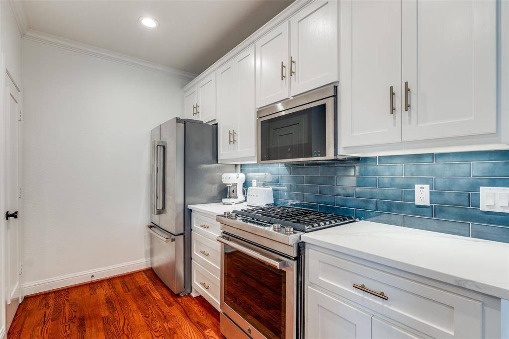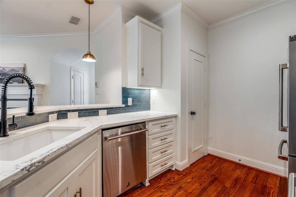 This is a rare end-unit in the Summit Belmont Townhome community, built by esteemed custom builder Oscar Ponder. This refined residence lives like a single-family home and is filled with natural light, offering enhanced privacy and an elevated design throughout. The interior is appointed with upscale finishes, including hardwood floors, solid core doors, and custom wood cabinetry. The kitchen has been beautifully updated with quartz countertops and premium stainless steel Jenn Air appliances. Upstairs, the expansive primary suite offers a sitting area, oversized walk-in closet, and an ensuite bath with quartz countertops, a soaking tub, and modern fixtures. Two secondary bedrooms share a Jack-and-Jill bath with updated finishes. Laundry is conveniently located on the second level. The entire interior of the unit has been recently painted. A private backyard features a brick patio and a turfed grassy area. The home also includes a two-car garage and dedicated guest parking directly in front. Ideally situated just one block from Lower Greenville and moments from Trader Joe's, Starbucks, and Henderson Avenue, this home offers a rare blend of luxury, comfort, and premier location.