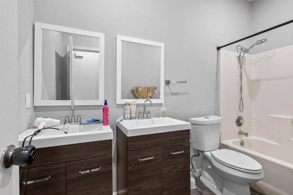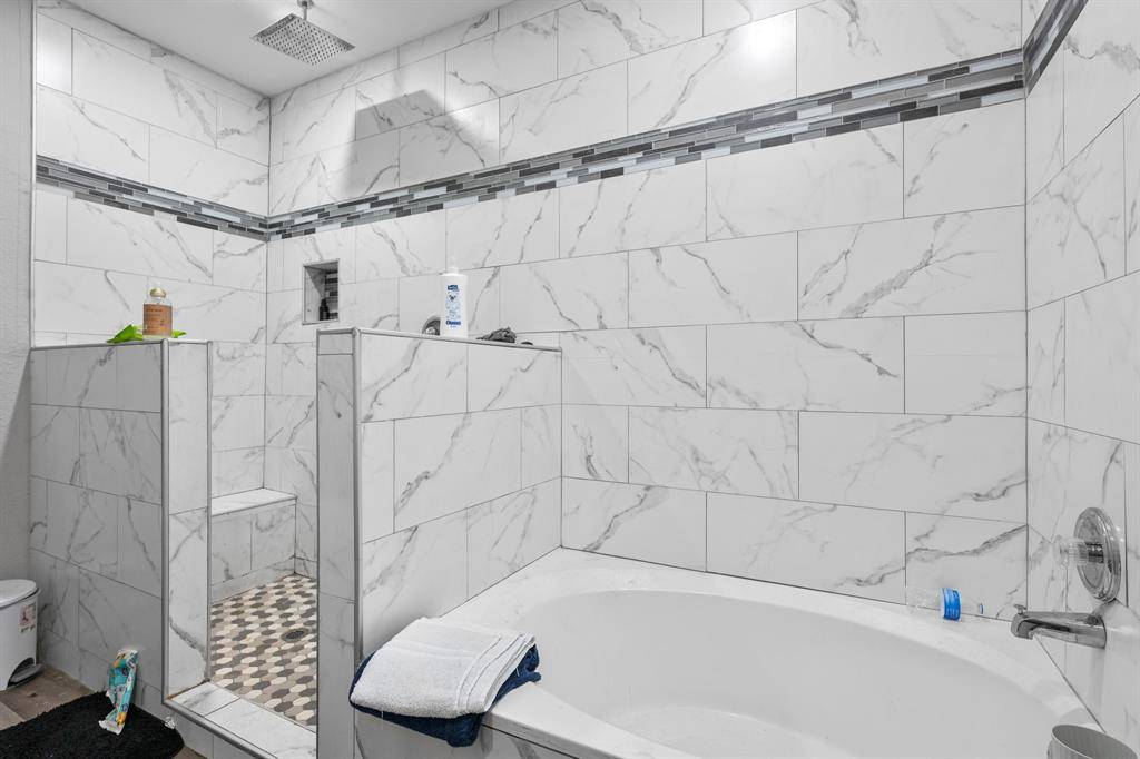 The primary suite includes a fully renovated bath with dual vanities, a soaking tub, and a separate walk-in shower. Three additional bedrooms provide flexibility for guests, office space, or growing households.